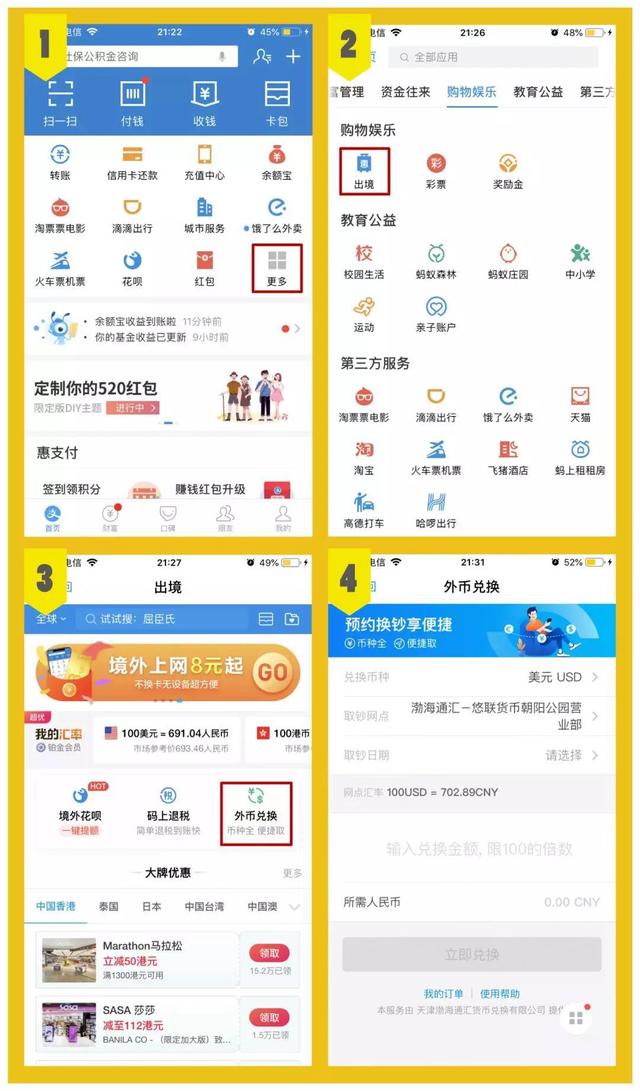 点击支付宝“首页-更多-购物娱乐-出境-外币兑换”: