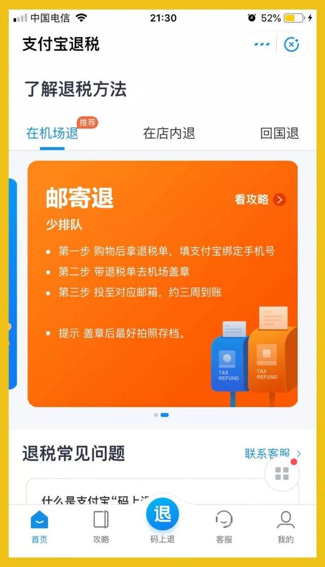 点击支付宝“首页-更多-购物娱乐-出境-码上退税”。支付宝退税有 2 种方式,“码上退”和“邮寄退”。