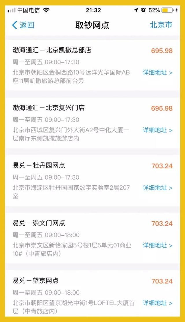 支持包括美元、日元、韩元、泰铢、欧元等在内的 27 个币种。每个取钞网点的汇率略有不同,比如同样是兑换 100 美元,各网点所需的人民币相差个几块钱: