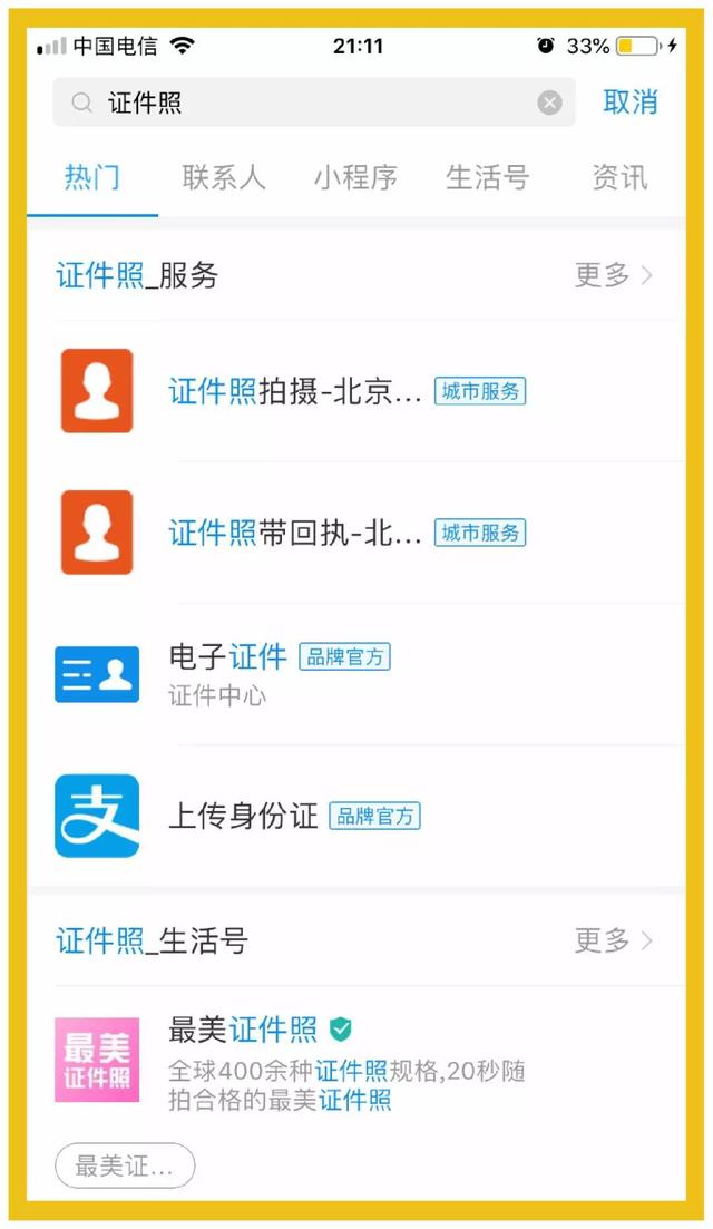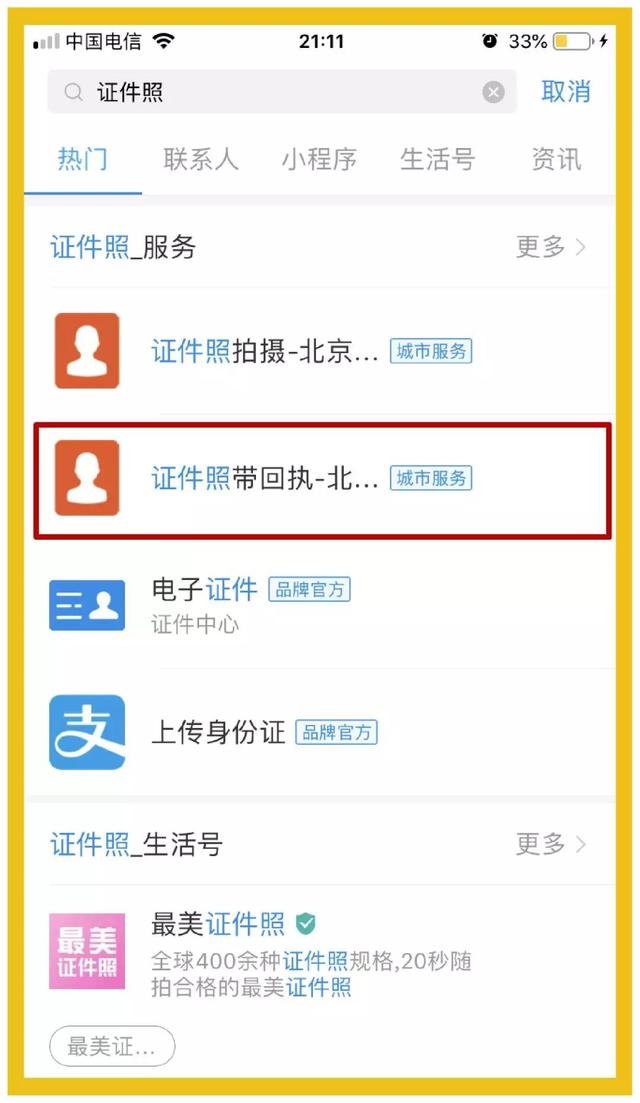 如果是需要回执的证件照,比如身份证、护照、驾驶证等用的照片,可以在支付宝首页搜索栏输关键词“证件照”,点击出现的“证件照带回执”: