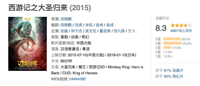 这是一部引发了国民级关注度的国产动画电影,豆瓣8.3,总票房9.56亿。尽管如同其他的动画电影一样,初期排片不占优势,但《大圣归来》依然依靠“自来水”的力量开辟出一个市场来。