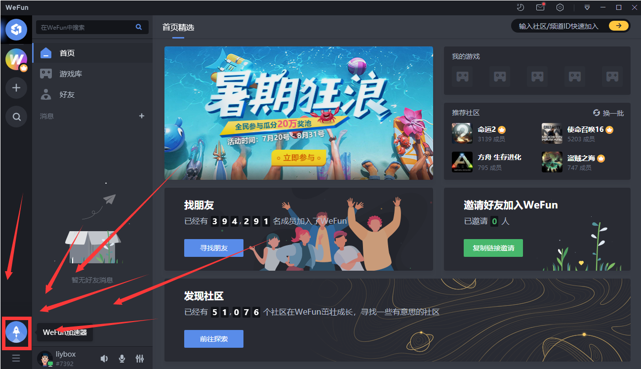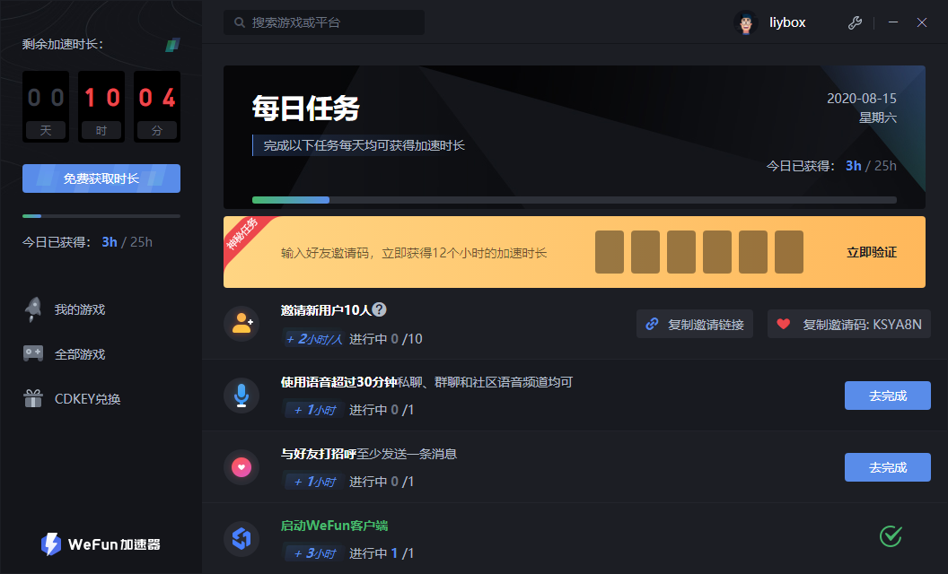 WeFun 加速器每天提供 3 小时免费时间,然后社区发消息+1 小时,语音 30 分钟+1 小时,邀请一个好友每天+2 小时,任务非常简单,每天非常轻松就可以获得 5+小时,可以满足大部分人的需求了。