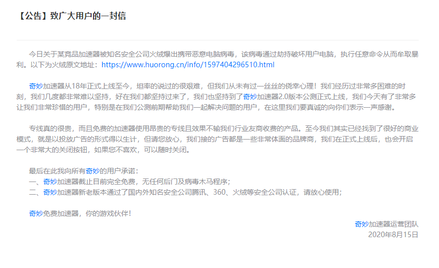 奇妙游戏加速器属于武汉奇妙科技有限公司,注册资金 3000 万,今天他也发出了致用户的一封信: