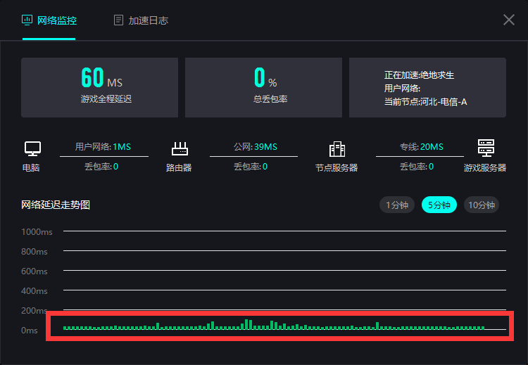 加速效果也是非常棒的,个人感觉优于UU加速器网吧版,通过实时网络可以看到波动非常小: