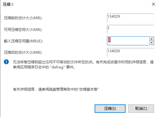 然后选择我们想要再分的区,右击,选择 压缩卷 ,点击 压缩 :