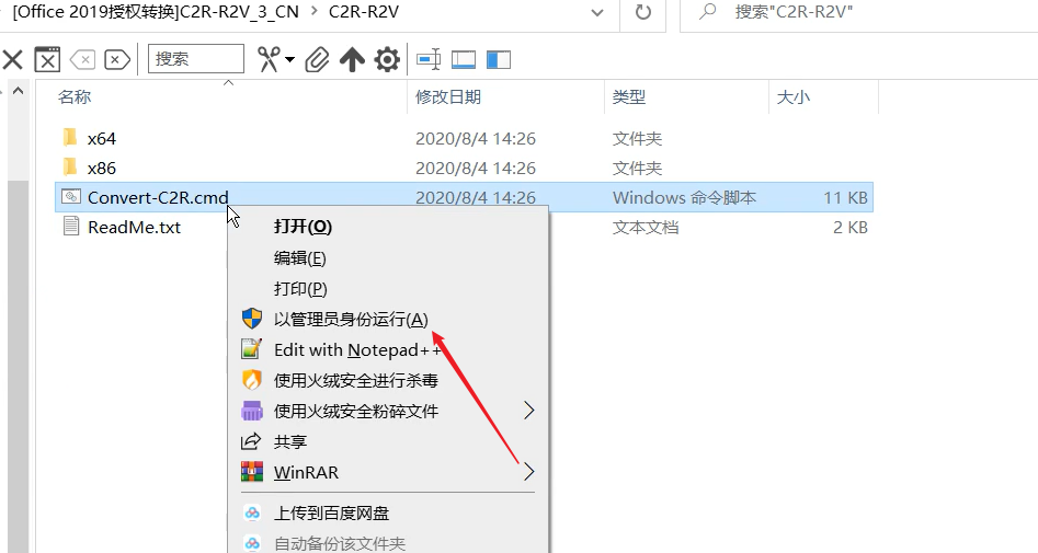 11.选择此文件夹下的【Convert-C2R.cmd】-【右键】-【以管理员身份运行】