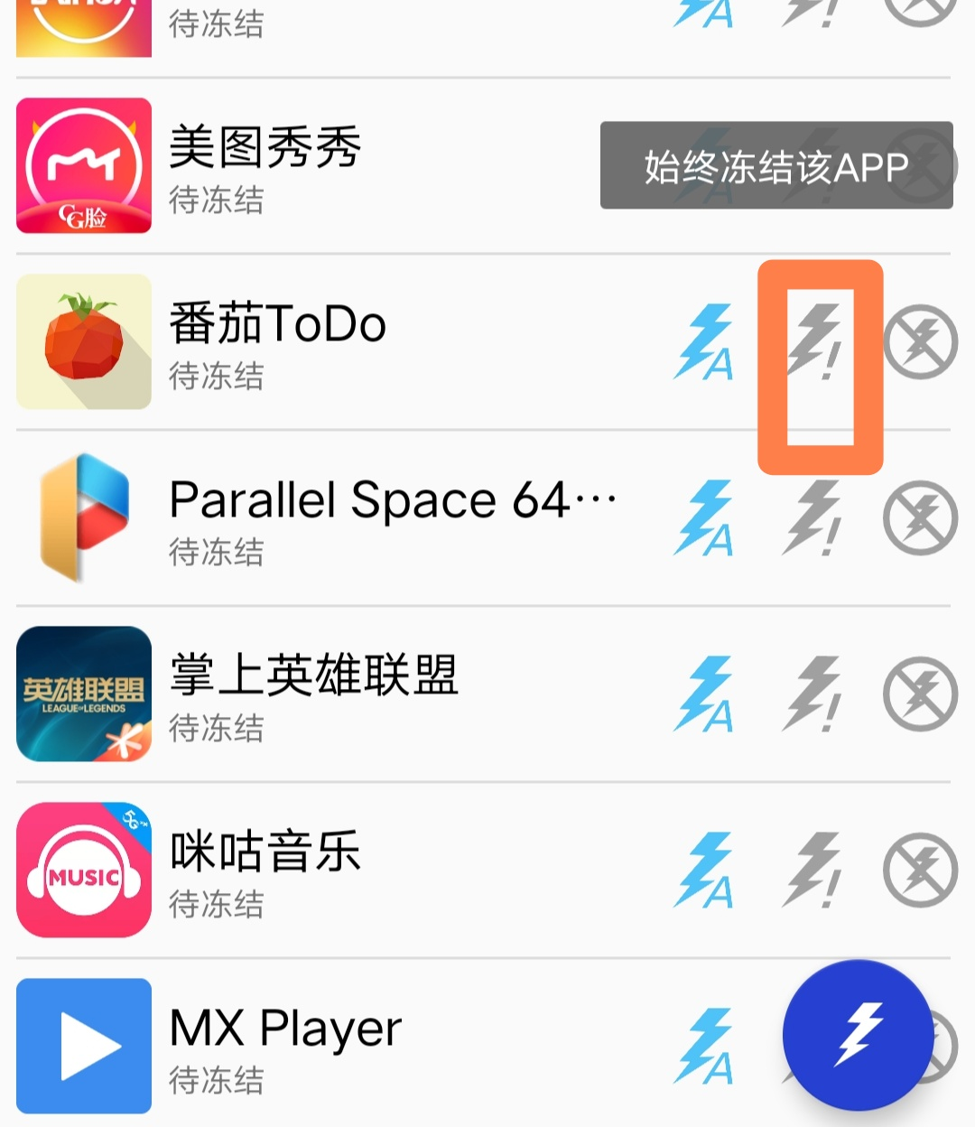 第一列是它推荐冻结的应用,可以点击第二个图标—始终冻结该app