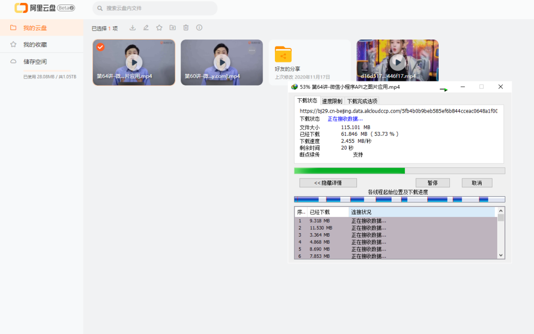 上传的速度真是惊艳到我了,同样一个视频,24MB,阿里云盘秒传,一个115兆的视频用了2秒钟,显示秒传。