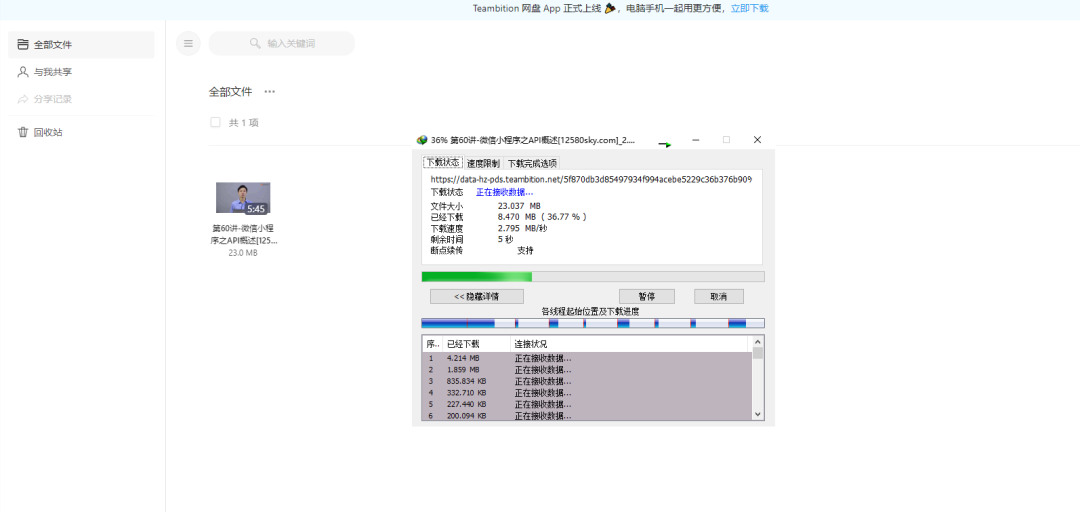 同样都是不限速,阿里云盘下载速度在2.4M/s左右,比teambition稍逊一筹,差别不大。