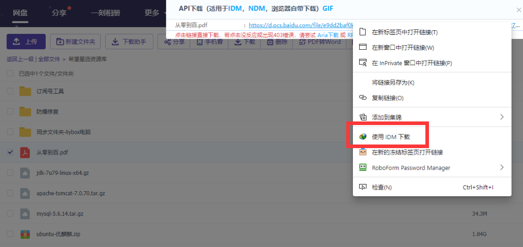 API 下载不是很稳定,适合小文件下载。我们选择文件后点击使用 API 下载,然后就会出现一个链接,我们右击链接,选择使用 IDM 下载(需要装 IDM 下载器和 IDM 扩展,点击这里安装),等待 IDM 出现文件名后(不要着急点下载),点击下载: