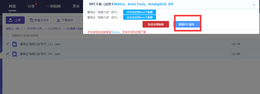 我们首先选择好文件,然后点击 RPC 下载 -> 点击发送到 Aria 下载器,此时链接会自动发送到 Motrix 中,需要注意的是,Motrix RPC 需要设置端口号为 16800: