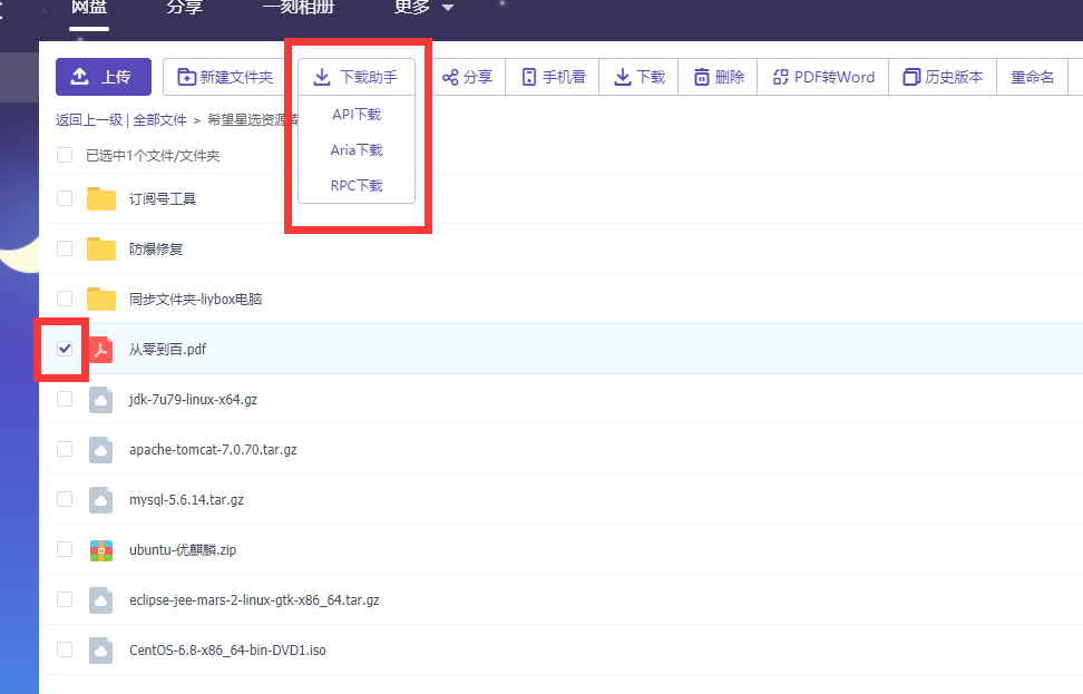此时我们登录百度网盘的网页版,然后选择我们要下载的文件(只能选择单个文件,不能选择整个文件夹),此刻出现“下载助手”的选项代表我们安装成功了: