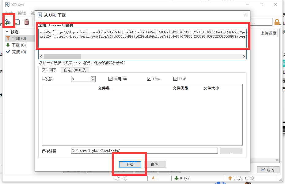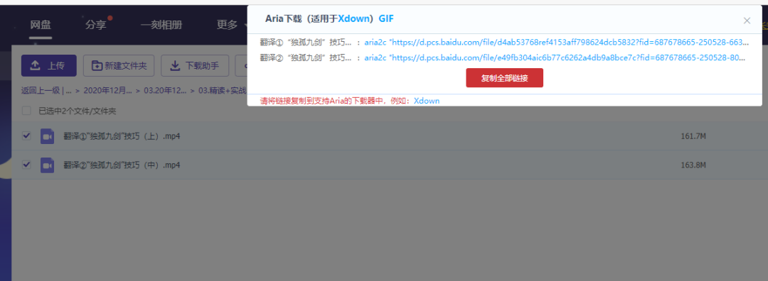 我们首先选择好文件,然后点击 Aria 下载,然后出现链接后点击“复制全部链接”,然后打开 XDown 下载器,将链接复制到下载器中: