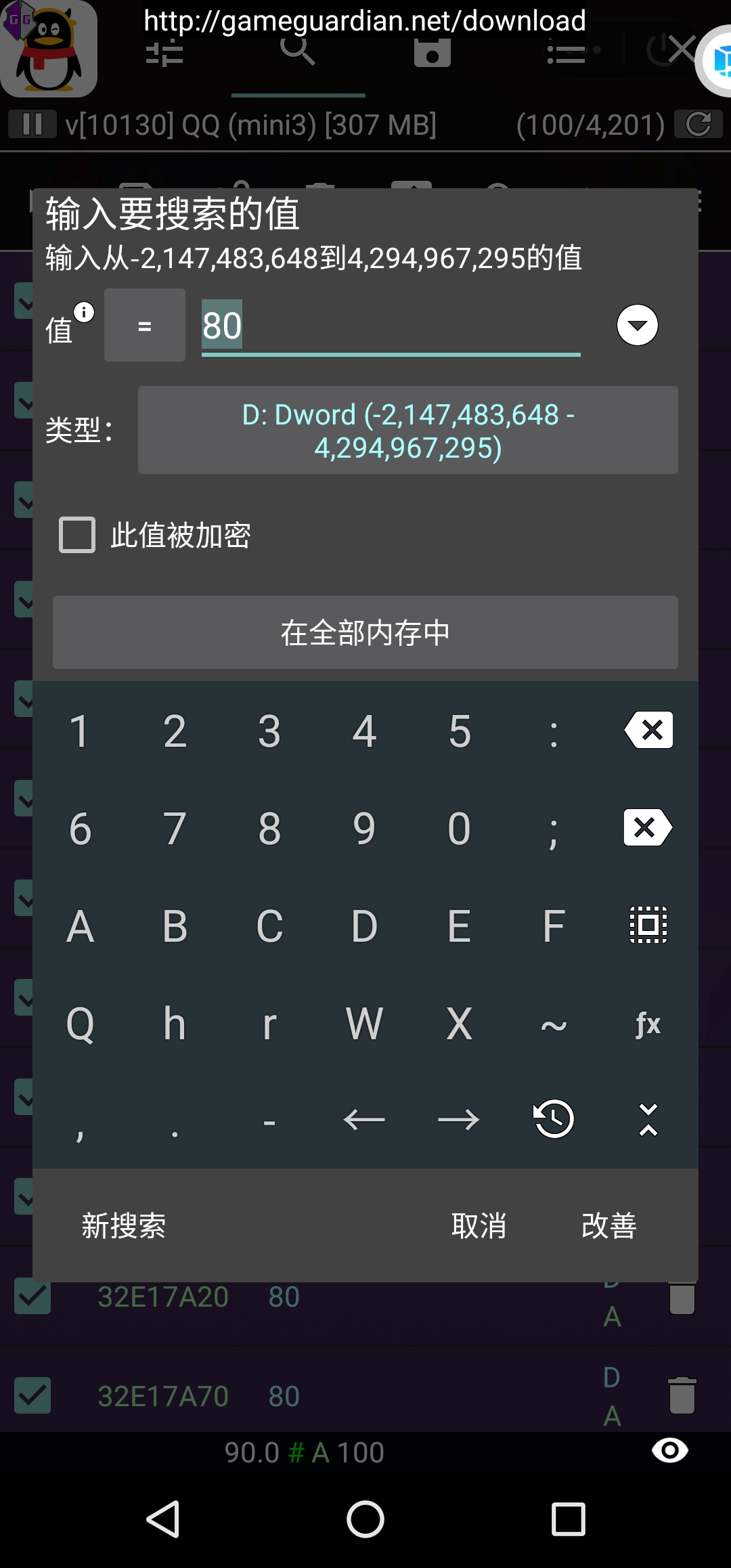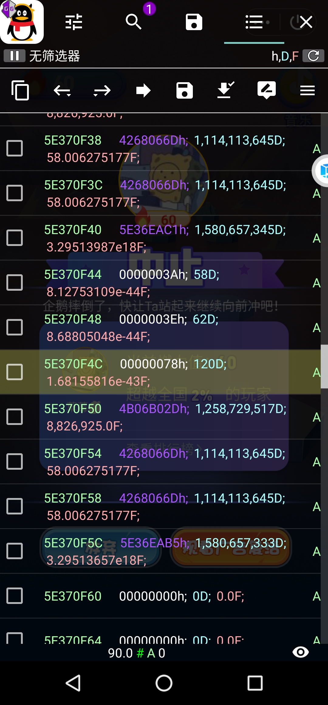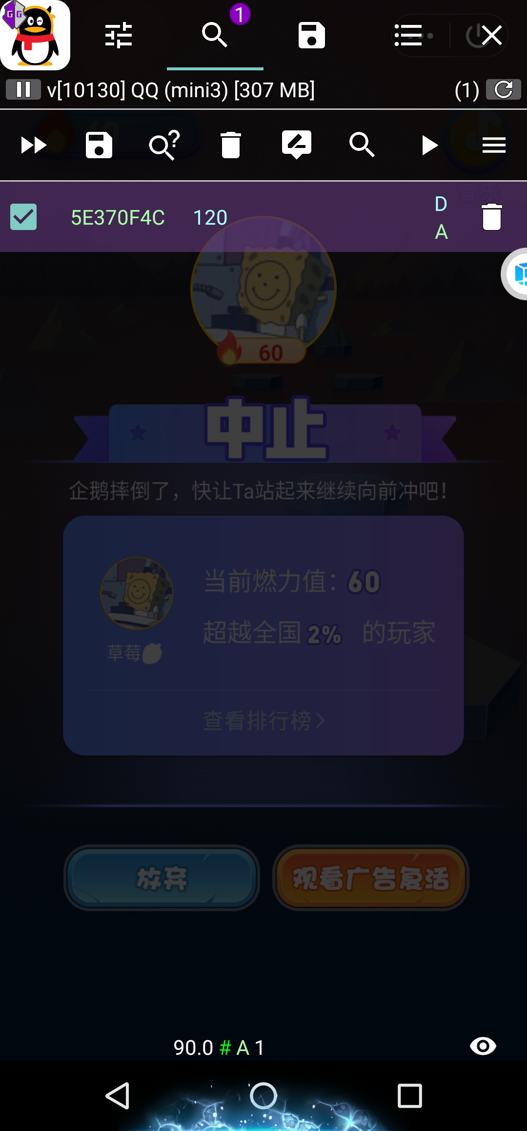 3.开一把单机,开始游戏直接跑,不用搜索0,跑几步就往下跳,然后修改分数x2,例如我40分,那么我就试试80
