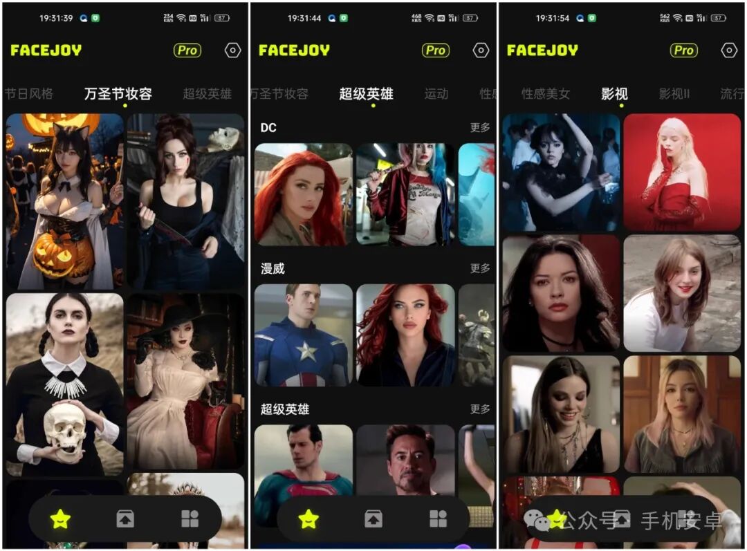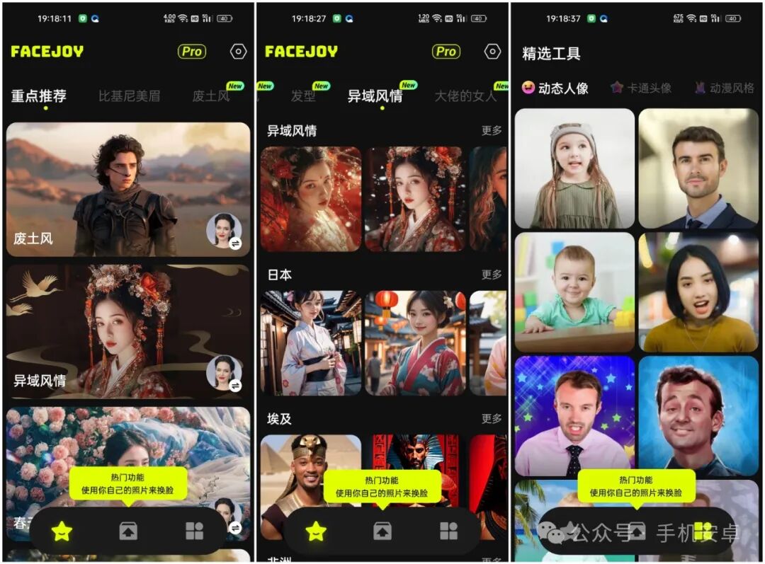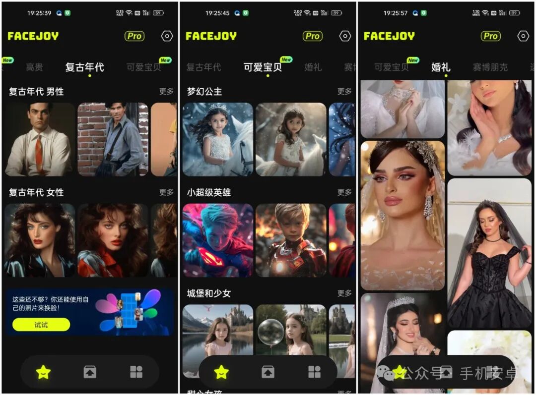 这是一款能够进行AI换脸的手机换脸神器,操作十分简单,只需要提供一张自己的正面照片或者他人照片,就能够轻松换上各种不同类型的角色和装扮,你想要的风格在这里都能够找到,里面有各种各样的图片视频模板,不管是气质美女、体育明星、各种发型、魅力型男,喜欢哪种风格都可以一键制作。只要一张面部照片,让您自己变成主角。已解锁专业版,你懂的!