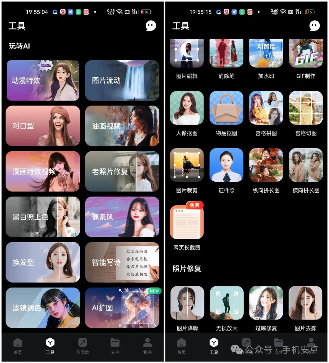 新版本的功能丰富了不少,除了基本的文生图和图生图外,还提供了AI写真、动漫特效(真人转动漫头像)、老照片修复、消除笔、对口型(AI数字人)、换发型、AI扩图等等强大功能,另外还提供了图片编辑、GIF制作、一键抠图、宫格拼图、图片裁剪等图片编辑和修复功能。