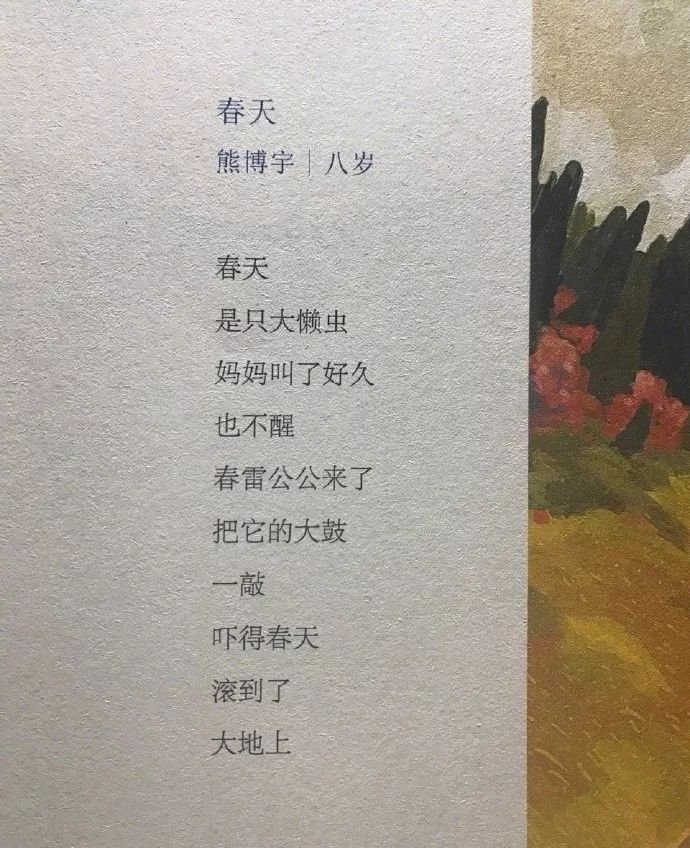 《春天》春天是只大懒虫妈妈叫了好久也不醒春雷公公来了把它的大鼓一敲吓得春天滚到了大地上