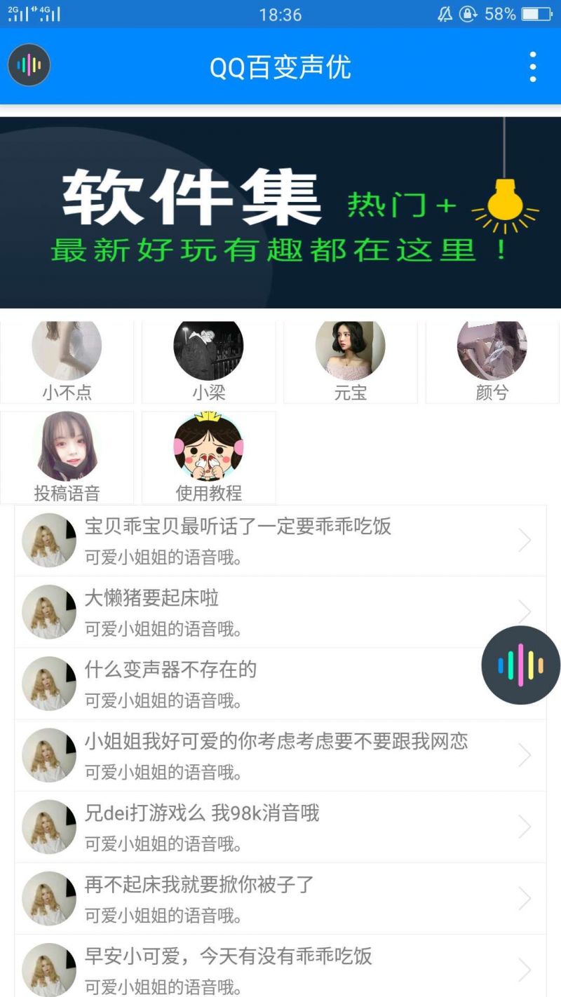 软件简绍:QQ百变声优-不同于上次的语音包,这次真正的变音,里面上千百中网红声优供你选择!从此以后 你就是萝莉