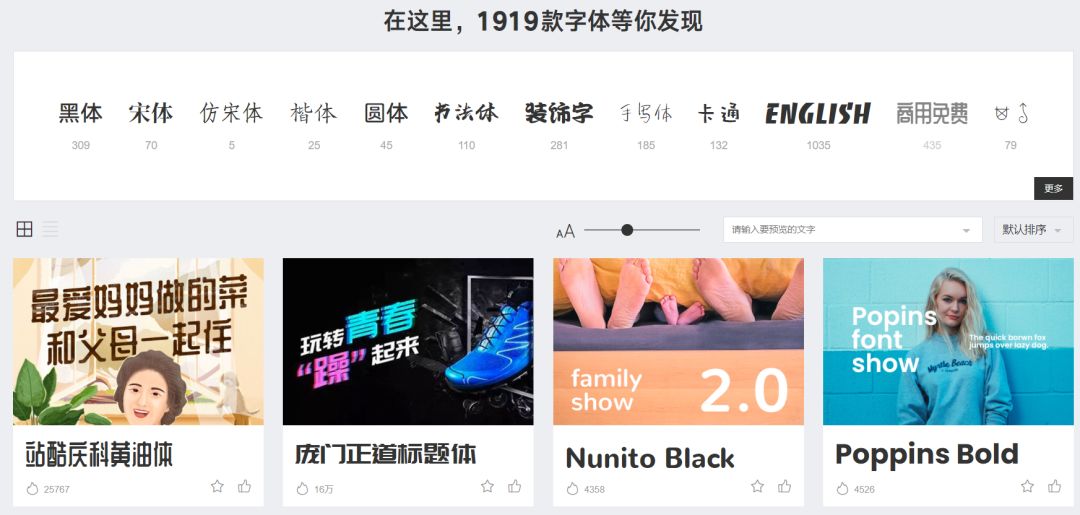 1919款字体任你挑选,还有很人性化的分类,你可以选择商用免费的,还可以看下需要的字体应用场景,看看是否真的合适你的作品。