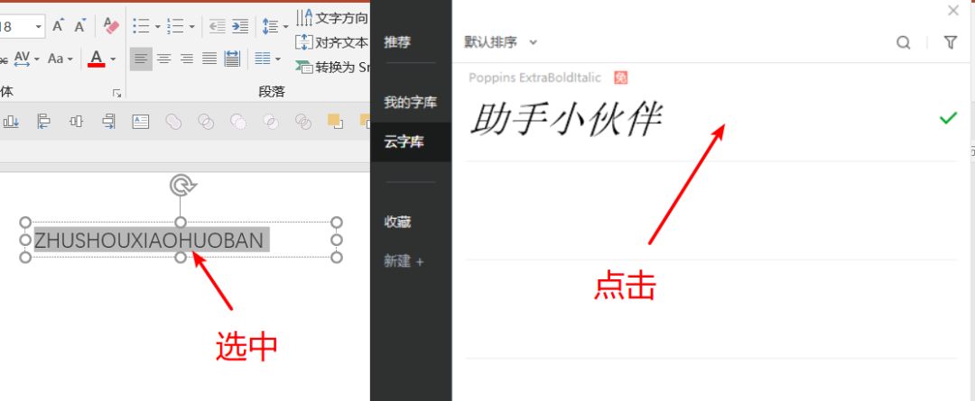 选中你需要更改字体的文字,直接点击即可生成,不需要在字体框里面搜索里。