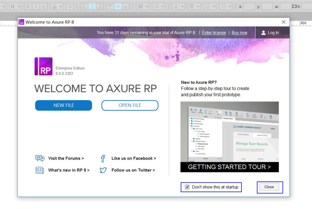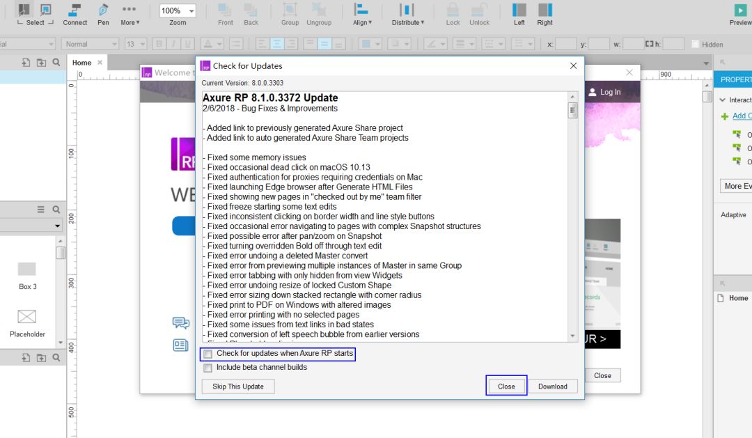 12、取消勾选Check for upadteswhen Axure RP start使其处于未选中状态,点击Close。