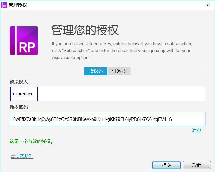 17、在弹出的界面上,填写被授权人:axureuser,授权密码:8wFfIX7a8hHq6yAy6T8zCz5R0NBKeVxo9IKu+kgKh79FL6IyPD6lK7G6+tqEV4LG,然后点提交。