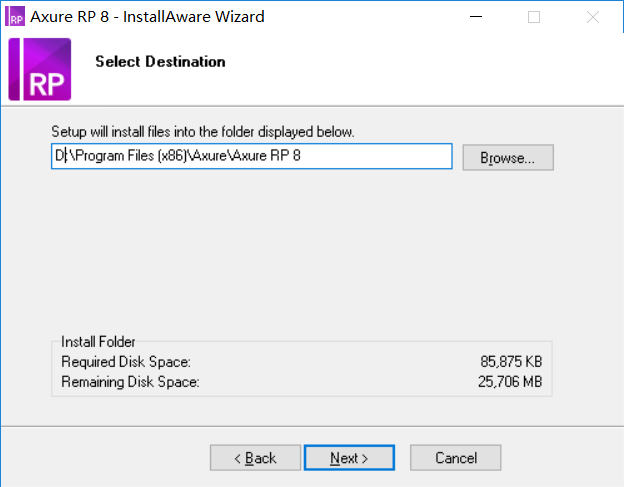 6、点击Browse更改安装路径建议安装到除C盘以外的磁盘,可在D盘或者其他盘创建一个Axure 8文件夹。然后点击Next。(直接把地址前面的C改为D或者即可)