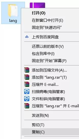 14、在解压的文件夹中找到lang,Ctrl+C复制或者鼠标右击选择选择复制。